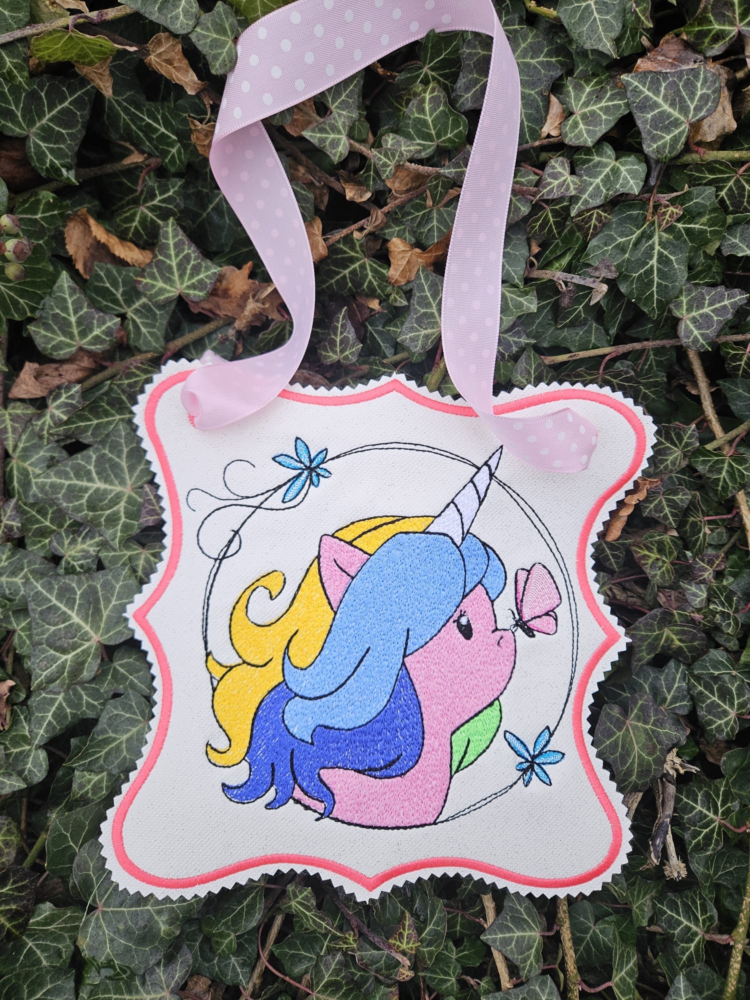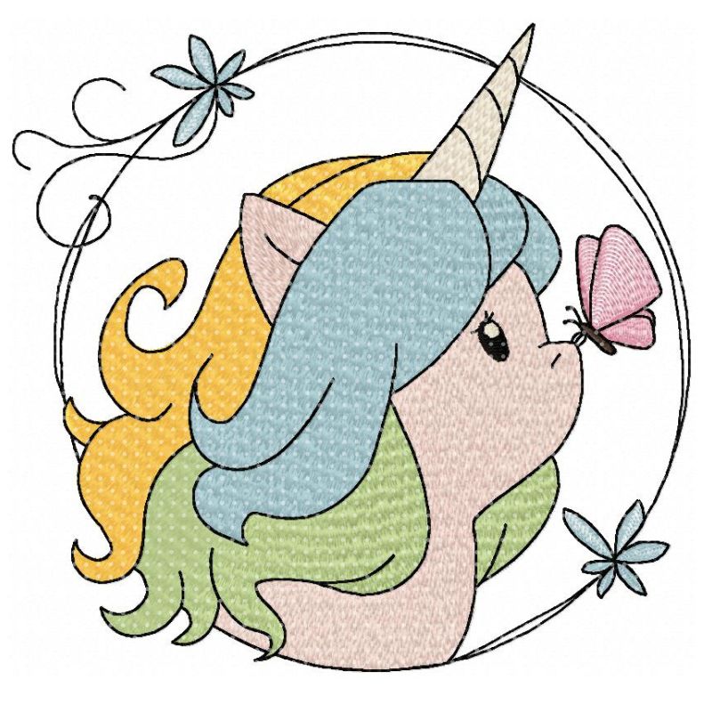 Dieses niedliche Einhorn setzt sich auf deinem Stoff in Szene und verleiht jeder Stickarbeit eine kindliche Note.