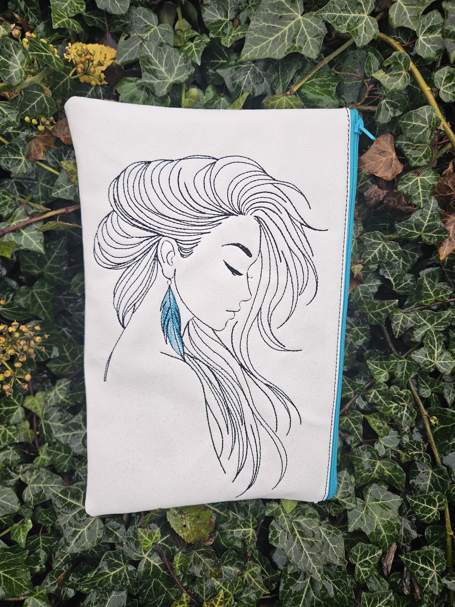 Diese zauberhafte Doodle Dame setzt sich auf deinem Stoff in Szene und verleiht jeder Stickarbeit eine künstlerische Note.