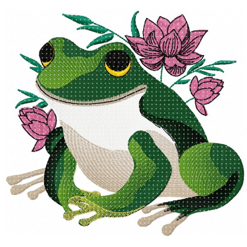 Dieser traumhafte Frosch setzt sich auf deinem Stoff in Szene und verleiht jeder Stickarbeit eine blumige Note.