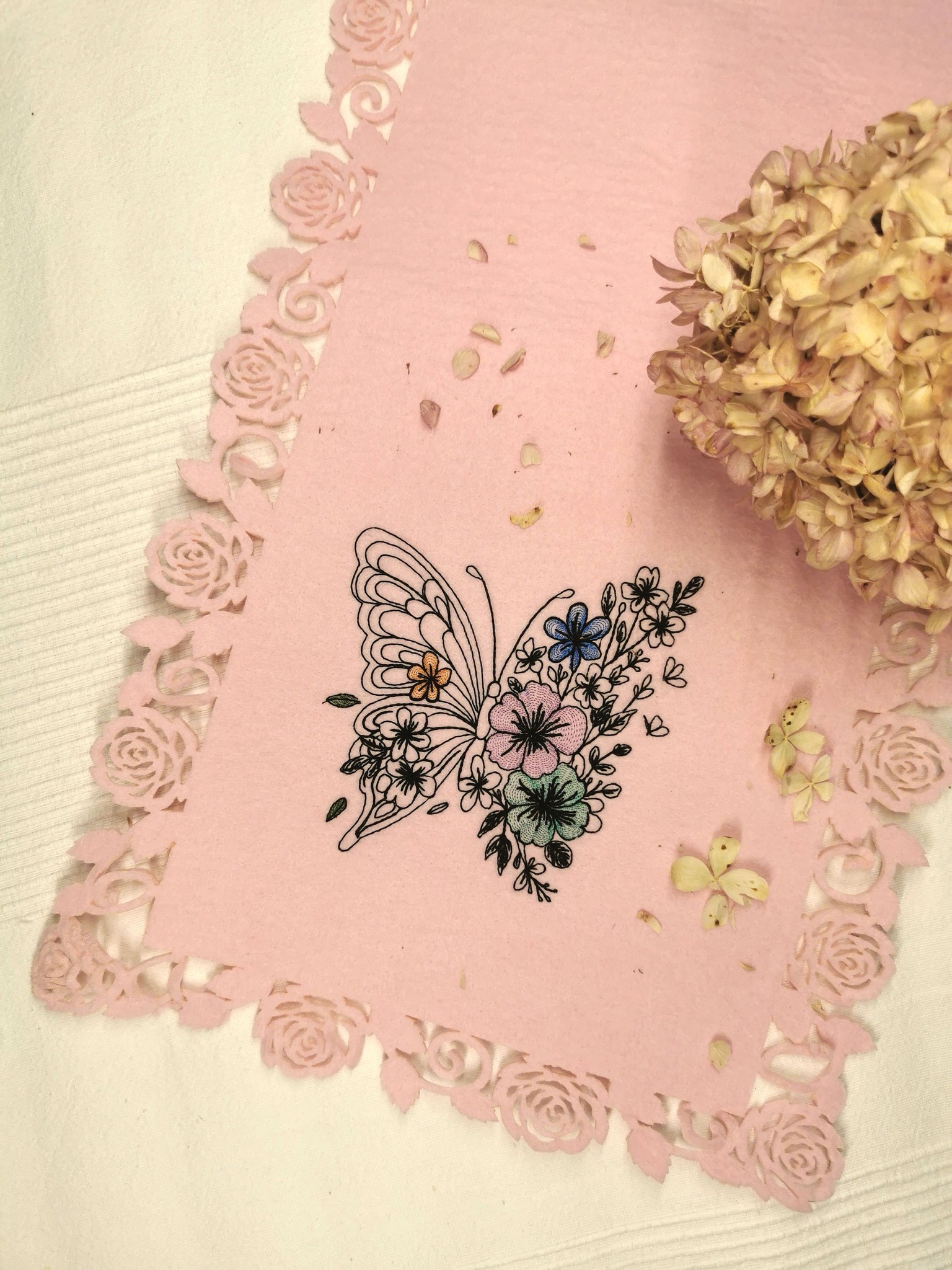 Schmetterling Stickdatei, sommerlicher Schmetterling mit Blumen für deine Stickmaschine